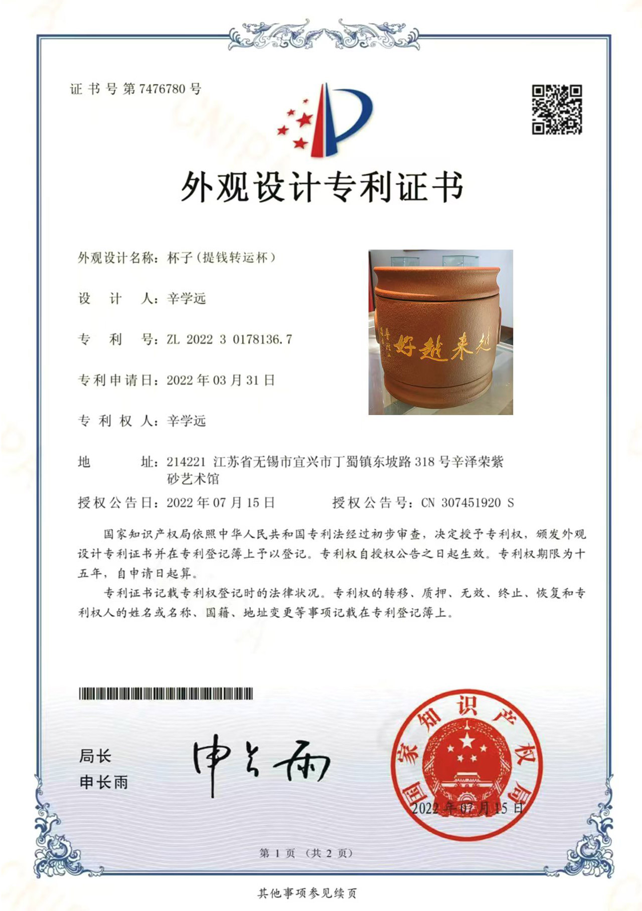This official Design Patent from China's National Intellectual Property Administration protects the original appearance of the "Tiqian Zhuan Yun Cup" . Designer: Xin Xueyuan. Application date: March 31, 2022. Patentee: Xin Xueyuan et al. Yixing teapots and accessories featuring this patented design are guaranteed authentic, original, and directly authorized.